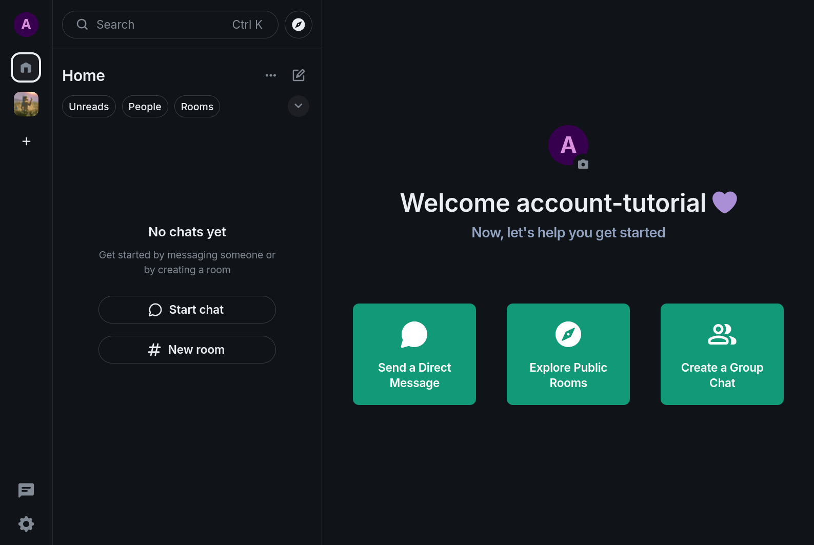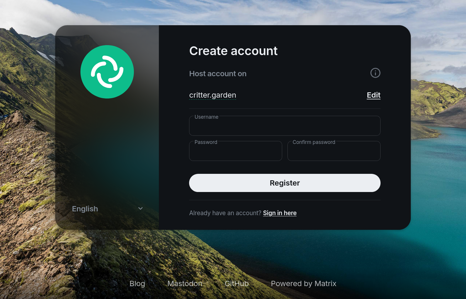 - Click the “Create Account” button. If you’re using the instance of Element hosted on critter.garden it should look like this: