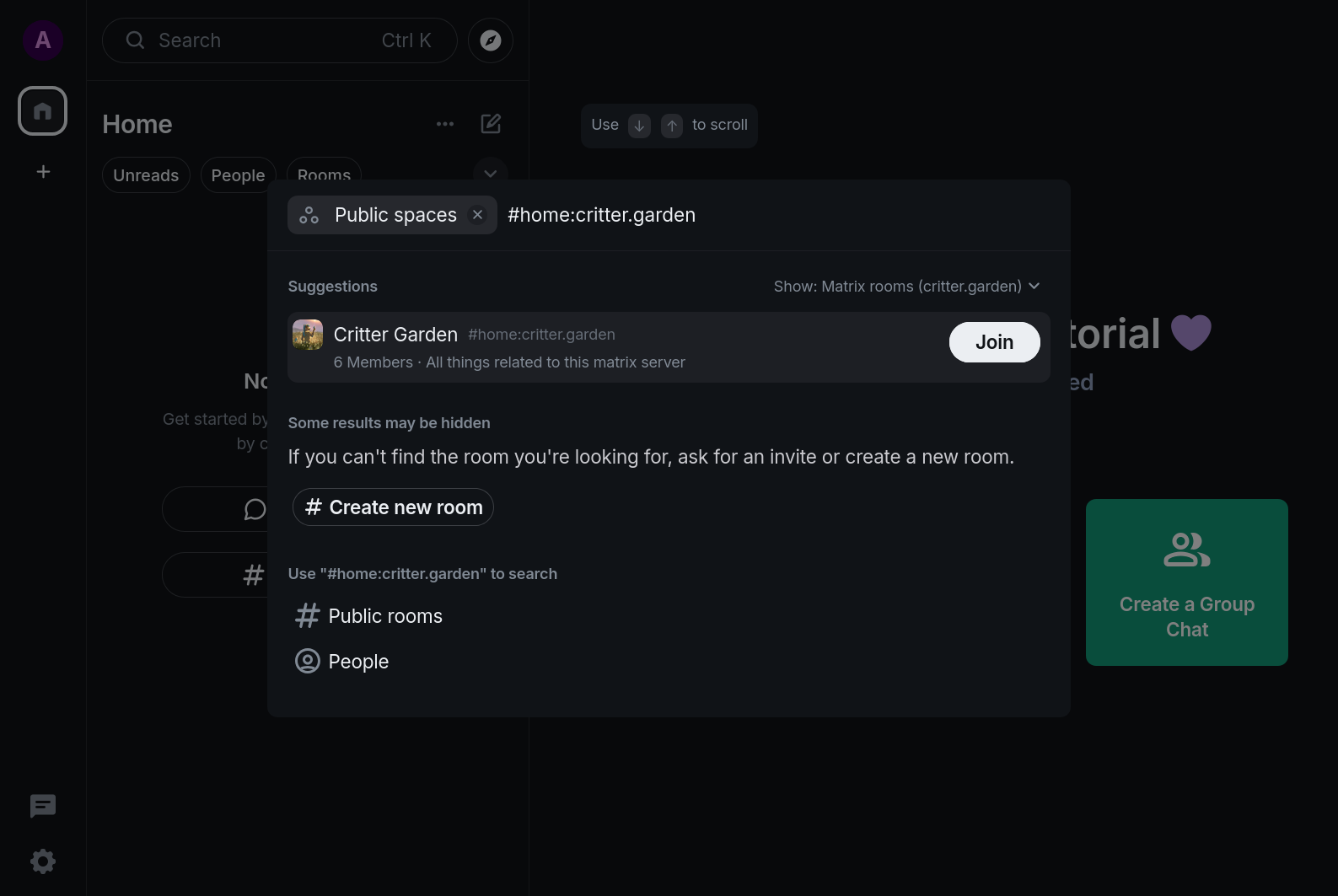 To ensure all users on the Critter Garden’s server are informed of any activity or issues that could impact their usage of the Matrix service a server Space and an announcements Room are provided for all server members to join. The Space and Room should be joined automatically by new accounts, where it’ll show up on the left side panel under the Home button as shown in the above screenshot. If it is not present, click into the search bar in the top left of the window (or press Ctrl+K) and search the term #home:critter.garden. After pressing enter on the search term you should see the Space listed under a Suggestions section, click Join to the right of the listing: