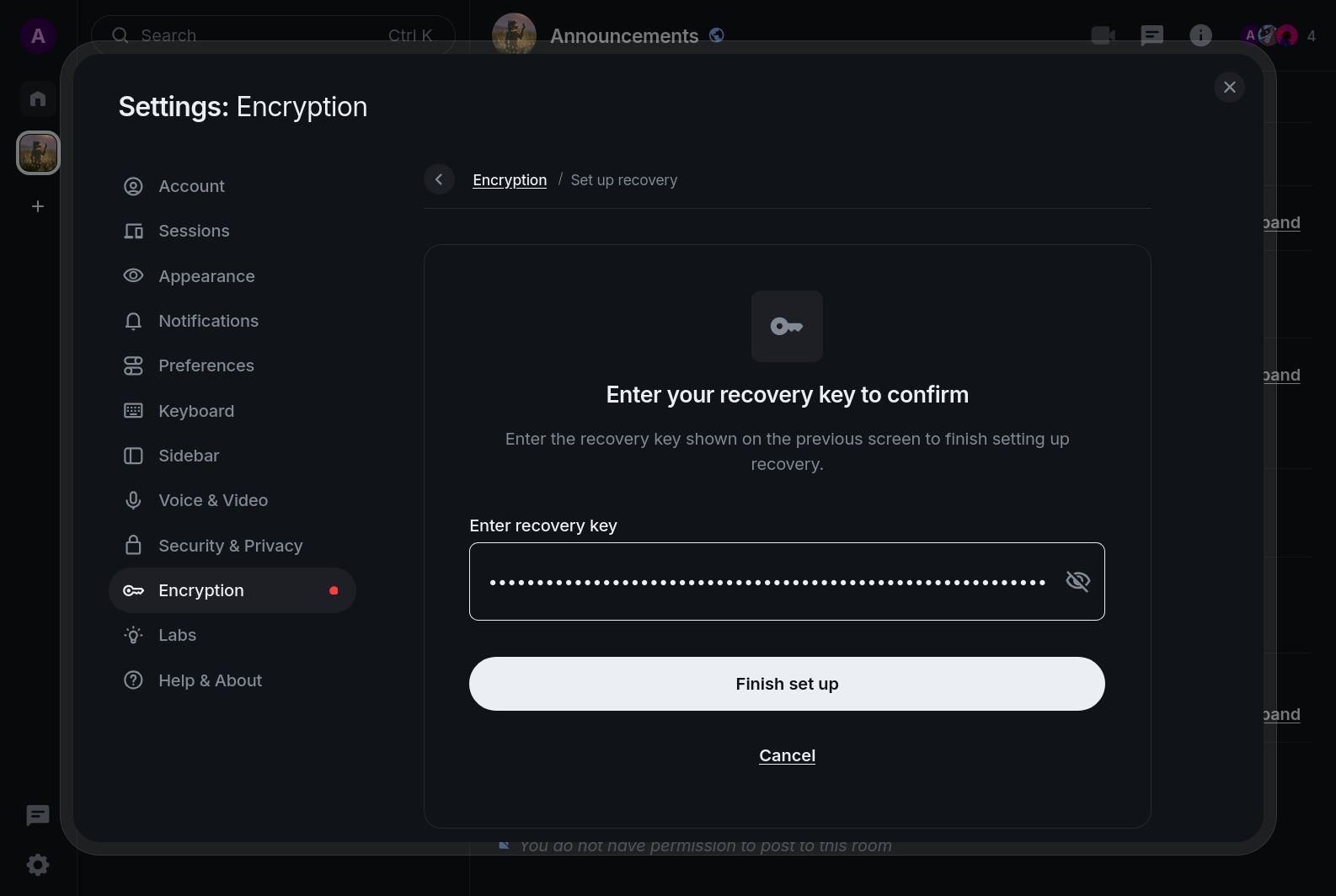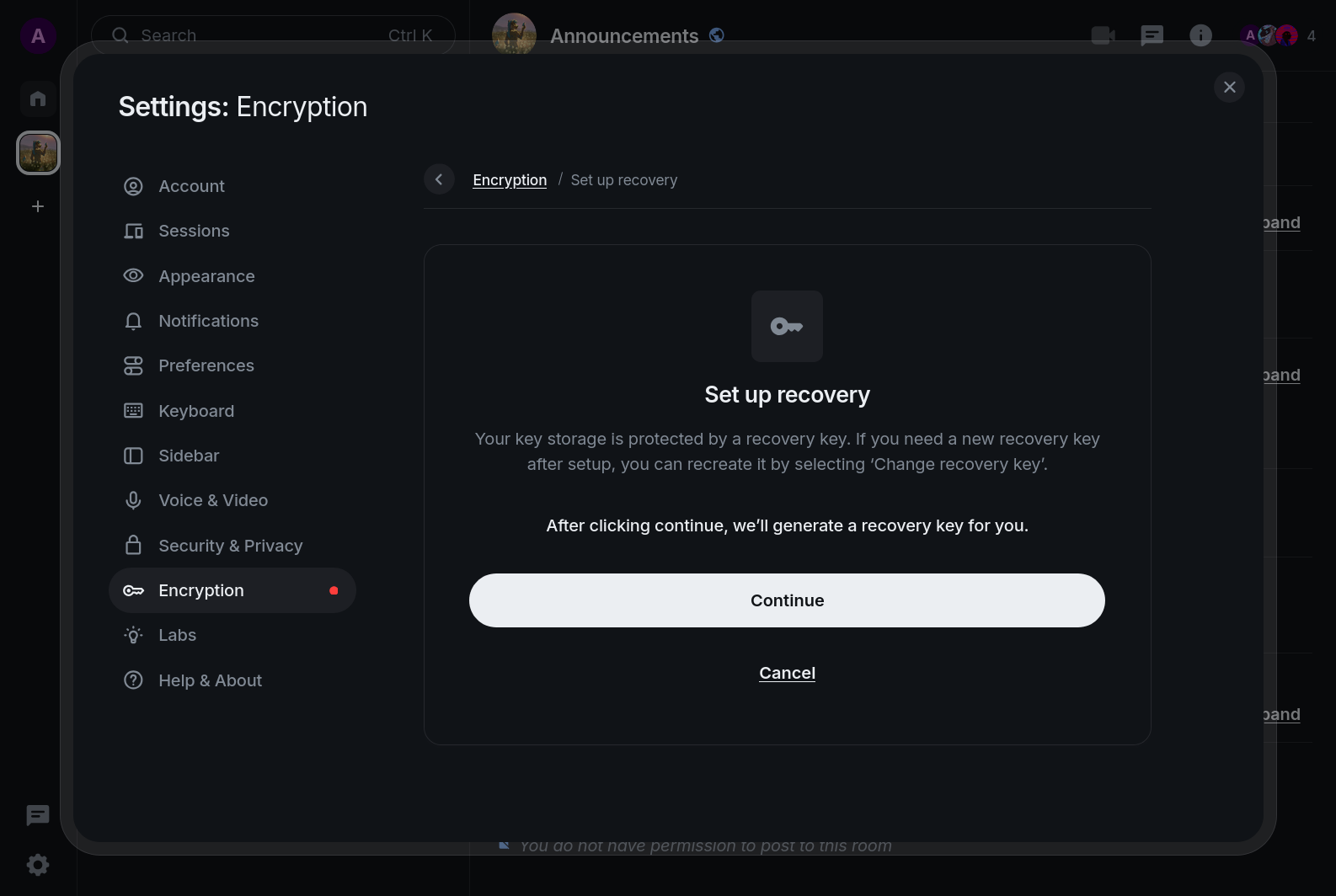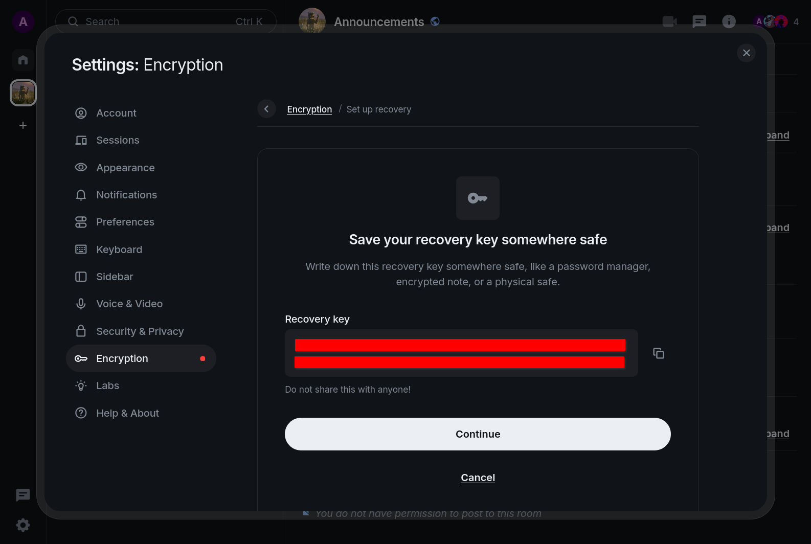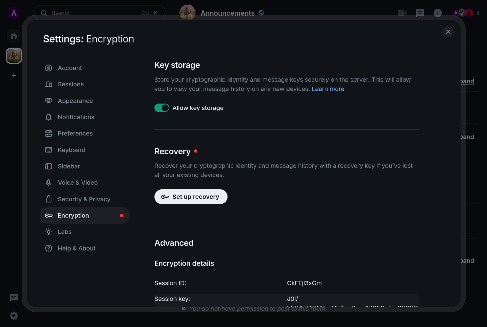 - One very important step to ensure you can access your account data on multiple devices/clients is to save your Recovery Key. Click on the Settings icon in the lower left corner of the window, select All Settings if a context menu pops up instead of the full settings menu, then navigate to the Encryption sub-page of the settings menu. On this page you will see a section labeled Recovery: