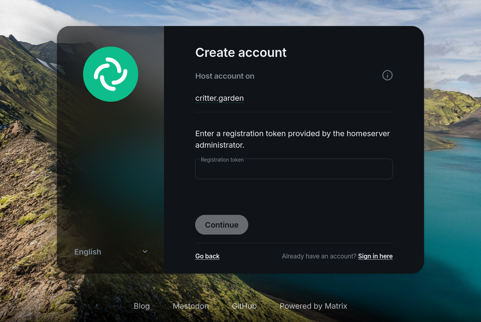 The Critter Garden uses semi-open registration, meaning anyone is welcome to join & create an account however you must be given a Registration Token by a current member of the server which is used during the account creation process. This system is put in place to increase the barrier of bots and bad-actors from entering the server and causing problems. If you are inviting someone to the server the current valid Registration Token is pinned in the Announcements room.