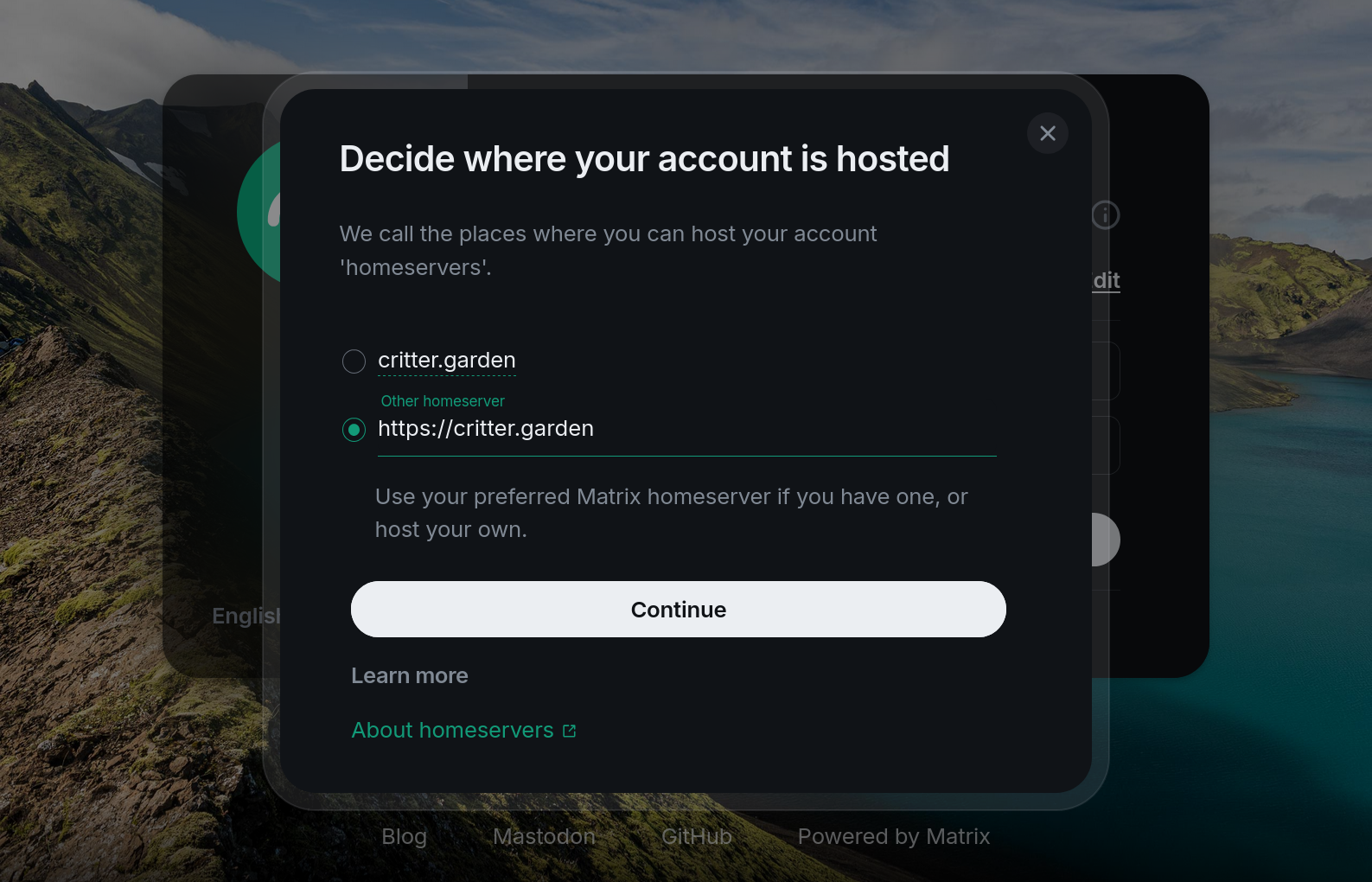 Check the URL under the text Host account on. If it does NOT say critter.garden then click the Edit button on the right side. In the pop-up, enter https://critter.garden into the Other homeserver field, then click Continue.
